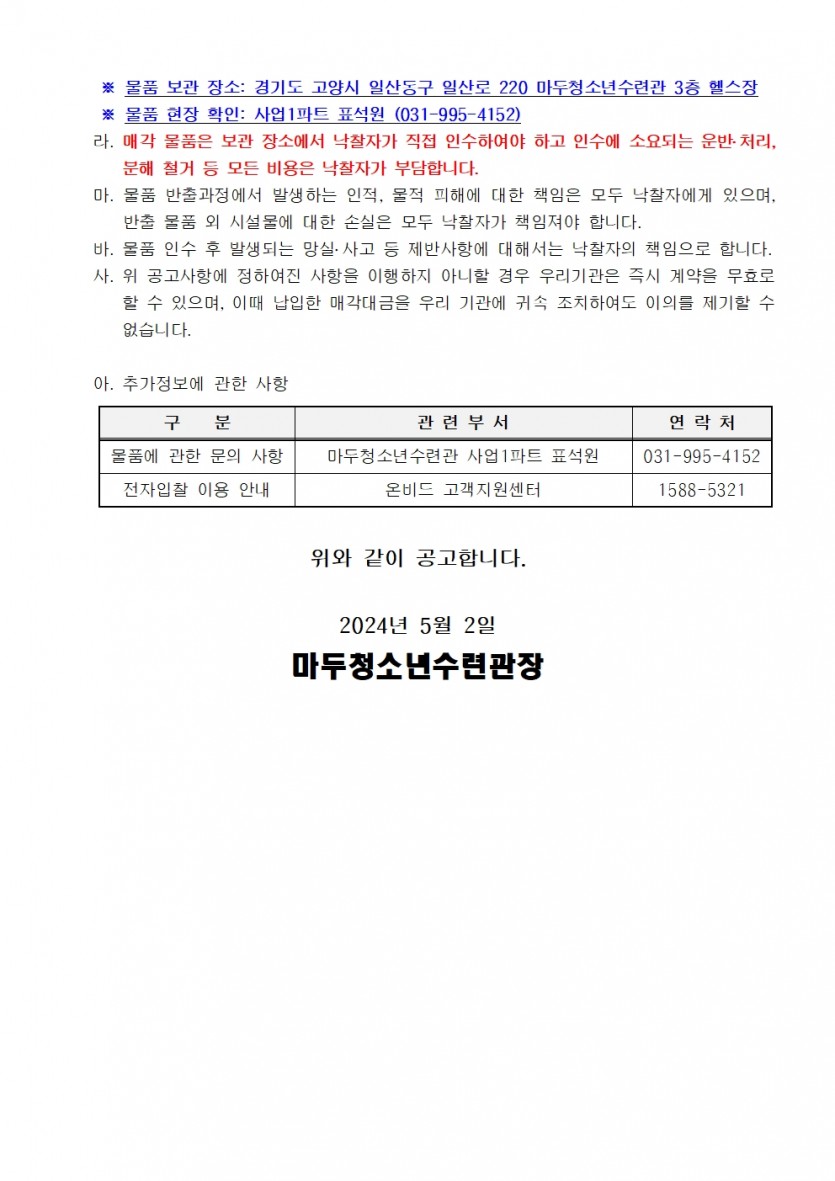 마두청소년수련관 [2024-8]2024년 마두청소년수련관 불용품(헬스기구) 매각 입찰 공고 페이지 정보 조회수 : 3,421회 등록일 : 2024-05-02 본문 첨부파일 마두청소년수련관 입찰공고 제2024-8호.hwp 4221회 다운로드 | DATE : 2024-05-02 10:07:37 목록 이전글[2024-9]2024년 마두청소년수련관 불용품(싸이클, 스텝퍼) 매각 입찰 공고 다음글[2024-7]2024년 마두청소년수련관 불용품(싸이클, 스텝퍼) 매각 입찰 취소 공고