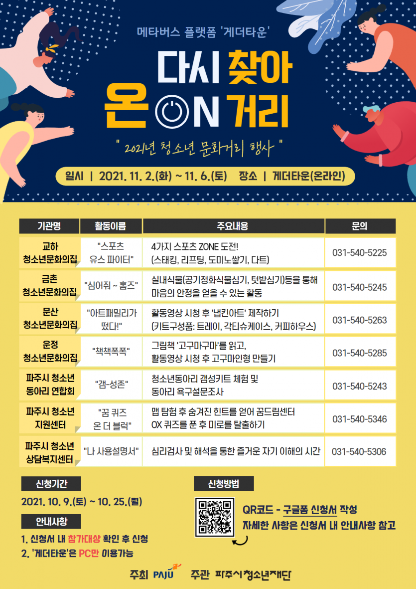 [파주시청소년재단] 메타버스에서 만나는 2021년 파주시 청소년 문화거리 행사 <다시 찾아ON 거리> 페이지 정보 조회수 : 3,430회 등록일 : 2021-10-20 본문 목록 이전글[고양시]「고양 생생소식」352호 다음글[강서구] 아동권리 그림 공모전 및 랩 경연대회