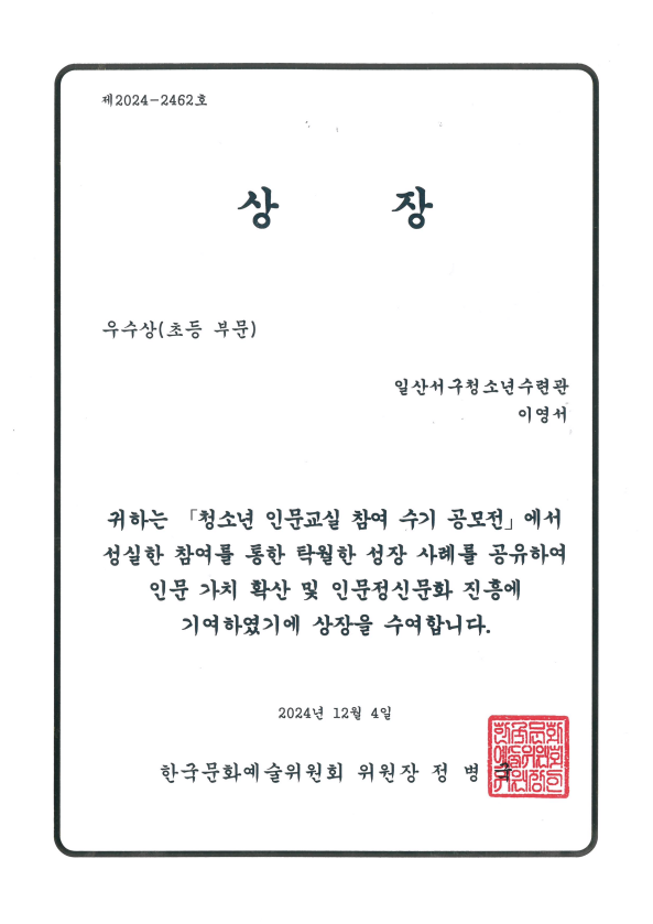 2024년 일산서구청소년수련관 2024년 청소년 인문교실 참여 수기 공모전 '우수상' 수상 이영서 페이지 정보 작성자 일산서구청소년수련관 조회 1,409회 작성일 2024-12-16 본문 목록 이전글[2024-기관] 2024년 청소년방과후아카데미 소방안전교육 활성화 경기도지사상(성사청소년문화의집) 다음글[2024-기관]2024년 우수 청소년활동 프로그램 지원 사업 장려상 수상