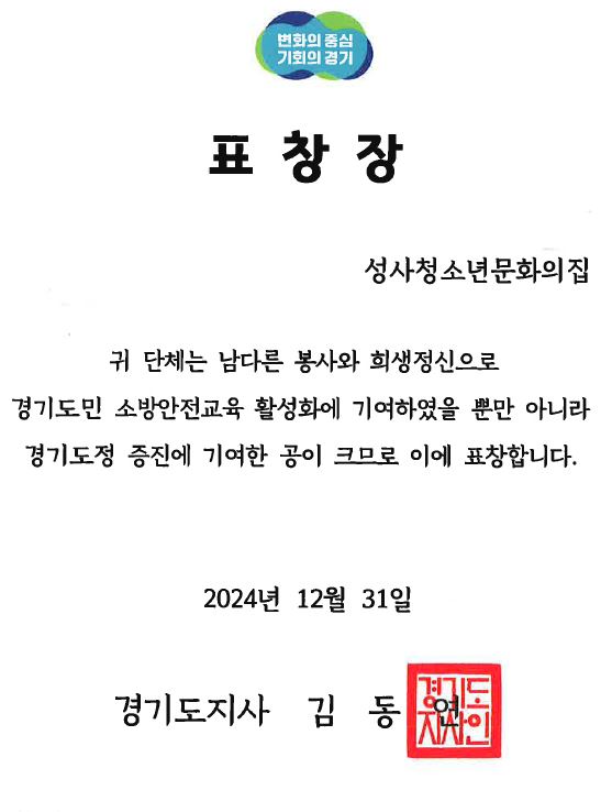 2024-12-31년 성사청소년문화의집 [2024-기관] 2024년 청소년방과후아카데미 소방안전교육 활성화 경기도지사상(성사청소년문화의집) 페이지 정보 작성자 성사청소년문화의집 조회 1,275회 작성일 2025-01-04 본문 목록 이전글[경기도수련시설협회장] 2025년 청소년수련시설 모범청소년지도자 표창 다음글2024년 청소년 인문교실 참여 수기 공모전 '우수상' 수상 이영서