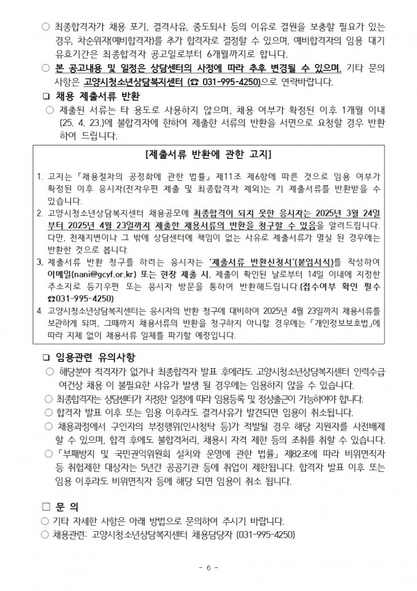 고양시청소년상담복지센터 2025년 고양시청소년상담복지센터 기간제근로자 채용 공고(시간제 이동상담상담사) 페이지 정보 조회수 : 3,855회 등록일 : 2025-03-06 본문 첨부파일 2025년 기간제근로자4차 채용 공고.pdf 59회 다운로드 | DATE : 2025-03-06 11:28:34 2025년 기간제근로자4차 채용 응시서류.hwp 2518회 다운로드 | DATE : 2025-03-06 11:28:34 검색 목록 이전글2025년 고양시청소년상담복지센터 기간제근로자(전일제·시간제 청소년동반자) 최종 합격자 공고 다음글2025년 고양시청소년상담복지센터 기간제근로자 채용 서류심사 합격자 및 면접심사 안내 공고(전일제·시간제 청소년동반자)