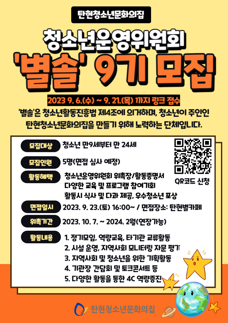 프로그램 신청 프로그램 현황 검색창 열기 시설선택 경영본부 토당청소년수련관 마두청소년수련관 일산서구청소년수련관 성사청소년문화의집 탄현청소년문화의집 고양시청소년상담복지센터 화정청소년자유공간 주교청소년자유공간 행신청소년자유공간 고양시학교밖청소년지원센터 송포청소년문화의집 검색 탄현청소년문화의집 [탄현] 청소년운영위원회 별솔 12기 모집 접수기간2025-11-18 ~ 2025-12-24 운영기간 2026-01-01 ~ 2026-12-31 모집중 탄현청소년문화의집 [탄현] 탄현청소년문화의집 고객만족도 조사 접수기간2025-10-14 ~ 2025-12-13 운영기간 2025-10-14 ~ 2025-12-13 마감 탄현청소년문화의집 [탄현] 별솔과 함께하는 별별이름공모전 접수기간2025-09-09 ~ 2025-10-18 운영기간 2025-09-09 ~ 2025-10-18 마감 탄현청소년문화의집 [지역교류] 내가 소개하는 우리 지역 '청소년 문화도슨트' 참가자 모집 접수기간2025-08-23 ~ 2025-09-12 운영기간 2025-09-13 ~ 2025-10-25 마감 탄현청소년문화의집 청소년 전동킥보드 안전교육 참가자 모집 접수기간2025-08-19 ~ 2025-08-26 운영기간 2025-08-26 ~ 2025-08-26 마감 탄현청소년문화의집 [탄현] 대학생 동아리와 함께하는 우주대축제 운영 접수기간2025-08-19 ~ 2025-08-23 운영기간 2025-08-24 ~ 2025-08-24 마감 탄현청소년문화의집 [참가자 모집] 탄현청소년문화의집 우주속으로 참가자 모집 접수기간2025-07-02 ~ 2025-07-12 운영기간 2025-07-13 ~ 2025-07-26 마감 탄현청소년문화의집 [탄현] 청소년운영위원회 별솔 11기 모집 접수기간2025-05-16 ~ 2025-05-31 운영기간 2025-05-31 ~ 2026-01-17 마감 탄현청소년문화의집 [탄현] 청소년버스킹 행사 안내 접수기간2025-05-16 ~ 2025-05-31 운영기간 2025-05-31 ~ 2025-05-31 마감 탄현청소년문화의집 별카페 원데이 활동 '별☆템 프로젝트' 접수기간2025-05-29 ~ 2025-05-30 운영기간 2025-05-30 ~ 2025-05-30 마감 탄현청소년문화의집 2025 청소년버스킹 자원봉사자 모집 접수기간2025-05-02 ~ 2025-05-23 운영기간 2025-05-31 ~ 2025-05-31 마감 탄현청소년문화의집 2025년 청소년 자율동아리 추가모집 접수기간2025-05-01 ~ 2025-05-20 운영기간 2025-01-01 ~ 2025-12-31 마감 탄현청소년문화의집 청소년별별놀이 '실로그린나' 접수기간2025-05-03 ~ 2025-05-20 운영기간 2025-05-24 ~ 2025-05-24 마감 탄현청소년문화의집 청소년봉사동아리 유성과 함께하는 디지털 디톡스 유아 스포츠 데이 접수기간2025-04-24 ~ 2025-05-07 운영기간 2025-05-11 ~ 2025-05-11 마감 탄현청소년문화의집 2025 청소년버스킹 공연팀 모집 접수기간2025-04-10 ~ 2025-04-26 운영기간 2025-05-31 ~ 2025-05-31 마감 탄현청소년문화의집 ☆별카페 청소년자율동아리 모집☆ 접수기간2025-02-20 ~ 2025-03-15 운영기간 2025-02-09 ~ 2025-12-31 마감 처음 이전 열린1페이지 2페이지 3페이지 다음 맨끝