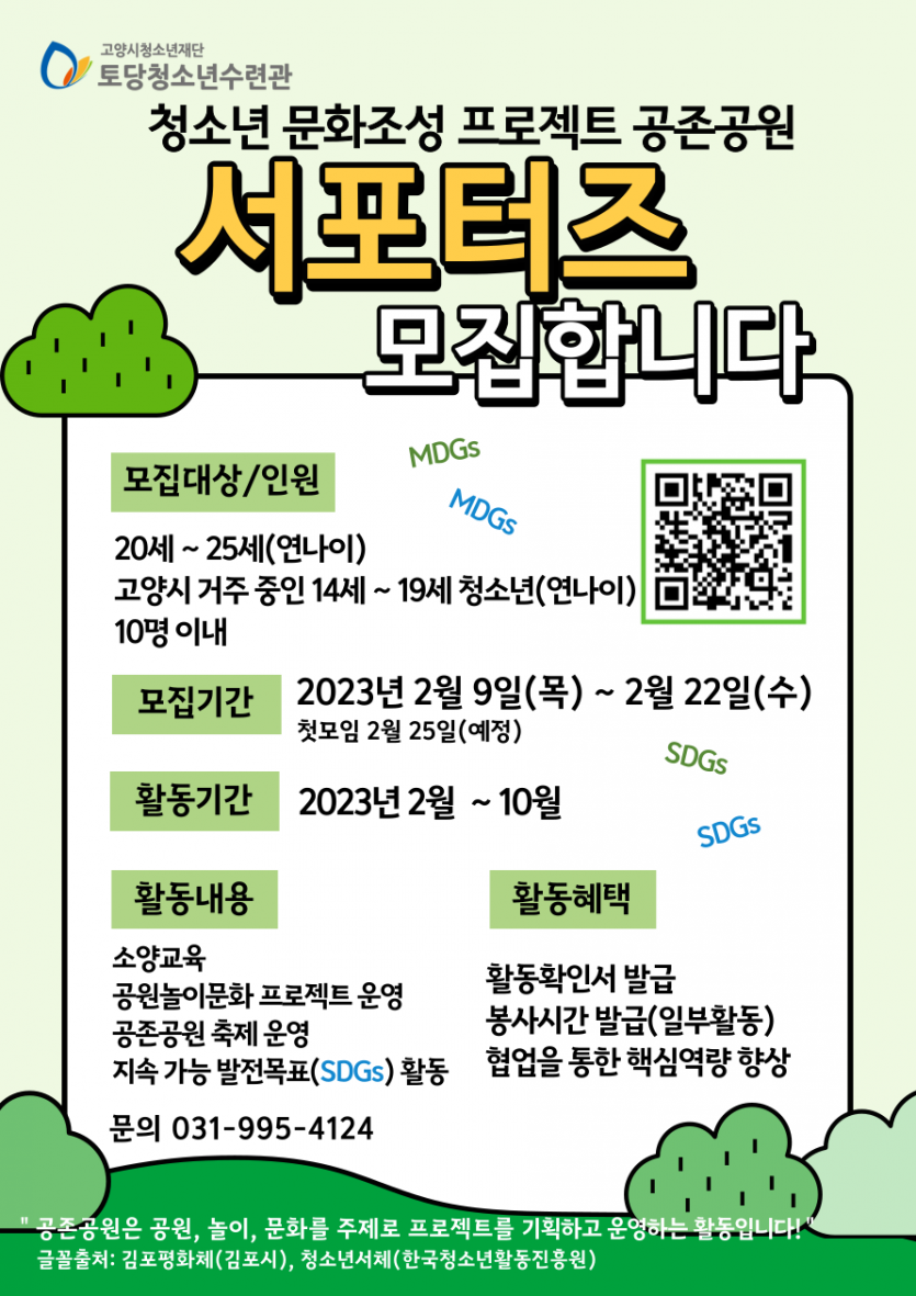 프로그램 신청 프로그램 현황 검색창 열기 시설선택 경영본부 토당청소년수련관 마두청소년수련관 일산서구청소년수련관 성사청소년문화의집 탄현청소년문화의집 고양시청소년상담복지센터 화정청소년자유공간 주교청소년자유공간 행신청소년자유공간 고양시학교밖청소년지원센터 송포청소년문화의집 검색 토당청소년수련관 청소년 마음건강 프로그램 'Re-Boost' 참가자 모집(K리그1 프로 축구 관람) 접수기간2025-08-07 ~ 2025-09-20 운영기간 2025-09-27 ~ 2025-09-27 마감 토당청소년수련관 중부대 밴드페스티벌 HI-TEEN 부스 및 경연대회 접수기간2025-08-27 ~ 2025-09-06 운영기간 2025-09-06 ~ 2025-09-06 마감 토당청소년수련관 2025 고양 소노스카이거너스배 청소년 3:3 농구대회 참가팀 모집 접수기간2025-04-15 ~ 2025-05-30 운영기간 2025-05-31 ~ 2025-06-01 마감 토당청소년수련관 2025. 제2회 Youth K-Culture Festival(청소년어울림마당) 개최 안내 접수기간2025-04-10 ~ 2025-05-17 운영기간 2025-05-17 ~ 2025-05-17 마감 토당청소년수련관 2025년 청소년 자율동아리 모집 안내 접수기간0202-01-02 ~ 2025-05-09 운영기간 2025-01-02 ~ 2025-12-31 마감 토당청소년수련관 2025. K-ROOKIES 선발전(청소년퍼포먼스대회) 참가자 모집 안내 접수기간2025-04-05 ~ 2025-04-28 운영기간 2025-05-17 ~ 2025-05-17 마감 토당청소년수련관 2025년 청소년 멘토링 동아리 '공시니' 멘티 모집 접수기간2025-04-12 ~ 2025-04-25 운영기간 2025-05-01 ~ 2025-12-31 마감 토당청소년수련관 2025년 고양특례시청소년어울림마당 2차(YKF) 운영부스 및 후원 단체 모집 안내 접수기간2025-03-18 ~ 2025-04-14 운영기간 2025-05-17 ~ 2025-05-17 마감 토당청소년수련관 청년&청소년 문화예술서포터즈 모집 접수기간2024-12-10 ~ 2025-01-20 운영기간 2025-02-01 ~ 2026-01-01 마감 토당청소년수련관 청년 스포츠서포터즈 모집 접수기간2024-12-10 ~ 2025-01-20 운영기간 2025-02-01 ~ 2026-01-01 마감 토당청소년수련관 청소년운영위원회 운영위원 모집 접수기간2024-12-10 ~ 2025-01-20 운영기간 2025-02-01 ~ 2026-01-01 마감 토당청소년수련관 2024년 토당청소년수련관 청소년 퍼포먼스 대회 K-ROOKISE 선발전 참가팀 모집 접수기간2024-03-28 ~ 2024-05-04 운영기간 2024-05-25 ~ 2024-05-25 마감 토당청소년수련관 2025년 토당청소년수련관 청소년 마음 건강 프로그램 'Re-Boost' 2차 활동(호신술 체험활동) 참가자 모집 접수기간2025-04-01 ~ 2024-04-08 운영기간 2025-04-26 ~ 2025-04-26 마감 토당청소년수련관 문화예술 전시회 토당갤러리 'TODANG GALLERY' 접수기간2023-10-04 ~ 2023-10-28 운영기간 2023-10-04 ~ 2023-10-28 마감 토당청소년수련관 월간문화 10회차 초콜렛 만들기 접수기간2023-10-19 ~ 2023-10-27 운영기간 2023-11-11 ~ 2023-11-11 마감 토당청소년수련관 월간문화 9회차 목공체험 접수기간2023-10-04 ~ 2023-10-18 운영기간 2023-10-28 ~ 2023-10-28 마감 처음 이전 열린1페이지 2페이지 다음 맨끝