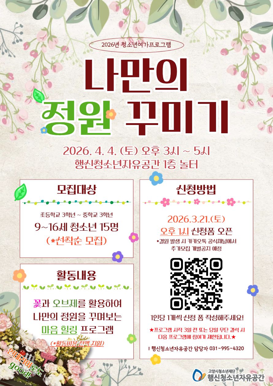 프로그램 신청 프로그램 현황 검색창 열기 시설선택 사무국 토당청소년수련관 마두청소년수련관 일산서구청소년수련관 성사청소년문화의집 탄현청소년문화의집 고양시청소년상담복지센터 화정청소년자유공간 주교청소년자유공간 행신청소년자유공간 고양시학교밖청소년지원센터 송포청소년문화의집 검색 행신청소년자유공간 2026년 행신청소년자유공간 [청소년여가프로그램 1회기 : 나만의 정원 꾸미기] 활동 안내 접수기간2026-03-21 ~ 2026-04-03 운영기간 2026-04-04 ~ 2026-04-04 마감 성사청소년문화의집 2026년 성사청소년문화의집 청소년미디어제작단 '액션' 9기 모집 접수기간2026-03-18 ~ 2026-03-31 운영기간 2026-03-01 ~ 2026-12-31 마감 마두청소년수련관 2026년 마두청소년수련관 자율동아리 모집 접수기간2026-02-03 ~ 2026-03-12 운영기간 2026-03-01 ~ 2026-12-31 마감 탄현청소년문화의집 [탄현] 청소년운영위원회 별솔 12기 상시모집 접수기간2025-11-18 ~ 2026-02-28 운영기간 2026-01-01 ~ 2026-12-31 마감 마두청소년수련관 2026년 마두청소년수련관 청소년운영위원회 신규위원 모집 접수기간2025-12-13 ~ 2026-02-14 운영기간 2026-03-01 ~ 2026-12-31 마감 마두청소년수련관 26년 마두청소년수련관 <제9대 고양시청소년의회> 의원을 모집합니다! 접수기간2025-12-11 ~ 2026-02-07 운영기간 2026-02-21 ~ 2026-12-31 마감 마두청소년수련관 제 26대 고양시 청소년참여위원회 위원 모집 공고 접수기간2025-01-01 ~ 2026-02-06 운영기간 2025-01-01 ~ 2026-02-06 마감 고양시청소년상담복지센터 미술치료 청소년 대상자 모집 접수기간2025-01-01 ~ 2025-12-31 운영기간 2025-01-01 ~ 2025-12-31 마감 고양시청소년상담복지센터 놀이치료 청소년 대상자 모집 접수기간2025-01-01 ~ 2025-12-31 운영기간 2025-01-01 ~ 2025-12-31 마감 성사청소년문화의집 2025년 성사청소년문화의집 청소년 자율동아리 모집 접수기간2025-01-01 ~ 2025-12-31 운영기간 2025-01-01 ~ 2025-12-31 마감 고양시학교밖청소년지원센터 고양시학교밖청소년지원센터 10~12월 프로그램 안내 접수기간2025-10-01 ~ 2025-12-31 운영기간 2025-10-01 ~ 2025-12-31 마감 주교청소년자유공간 주교청소년자유공간 12월 청소년여가프로그램: 영화로 꿈꾸는 데이 접수기간2025-12-01 ~ 2025-12-31 운영기간 2025-12-01 ~ 2025-12-31 마감 주교청소년자유공간 주교청소년자유공간 12월 청소년여가프로그램: 크리스마스 케이크 만들기 접수기간2025-12-01 ~ 2025-12-31 운영기간 2025-12-01 ~ 2025-12-31 마감 주교청소년자유공간 주교청소년자유공간 12월 청소년창작프로그램 "크리스마스 리스 만들기" 접수기간2025-12-01 ~ 2025-12-31 운영기간 2025-12-01 ~ 2025-12-31 마감 탄현청소년문화의집 [탄현] 탄현청소년문화의집 고객만족도 조사 접수기간2025-10-14 ~ 2025-12-13 운영기간 2025-10-14 ~ 2025-12-13 마감 고양시청소년상담복지센터 집단심리검사프로그램 - MBTI 바로알기 접수기간2025-05-15 ~ 2025-11-30 운영기간 2025-05-16 ~ 2025-12-31 마감 처음 이전 열린1페이지 2페이지 3페이지 4페이지 5페이지 6페이지 다음 맨끝