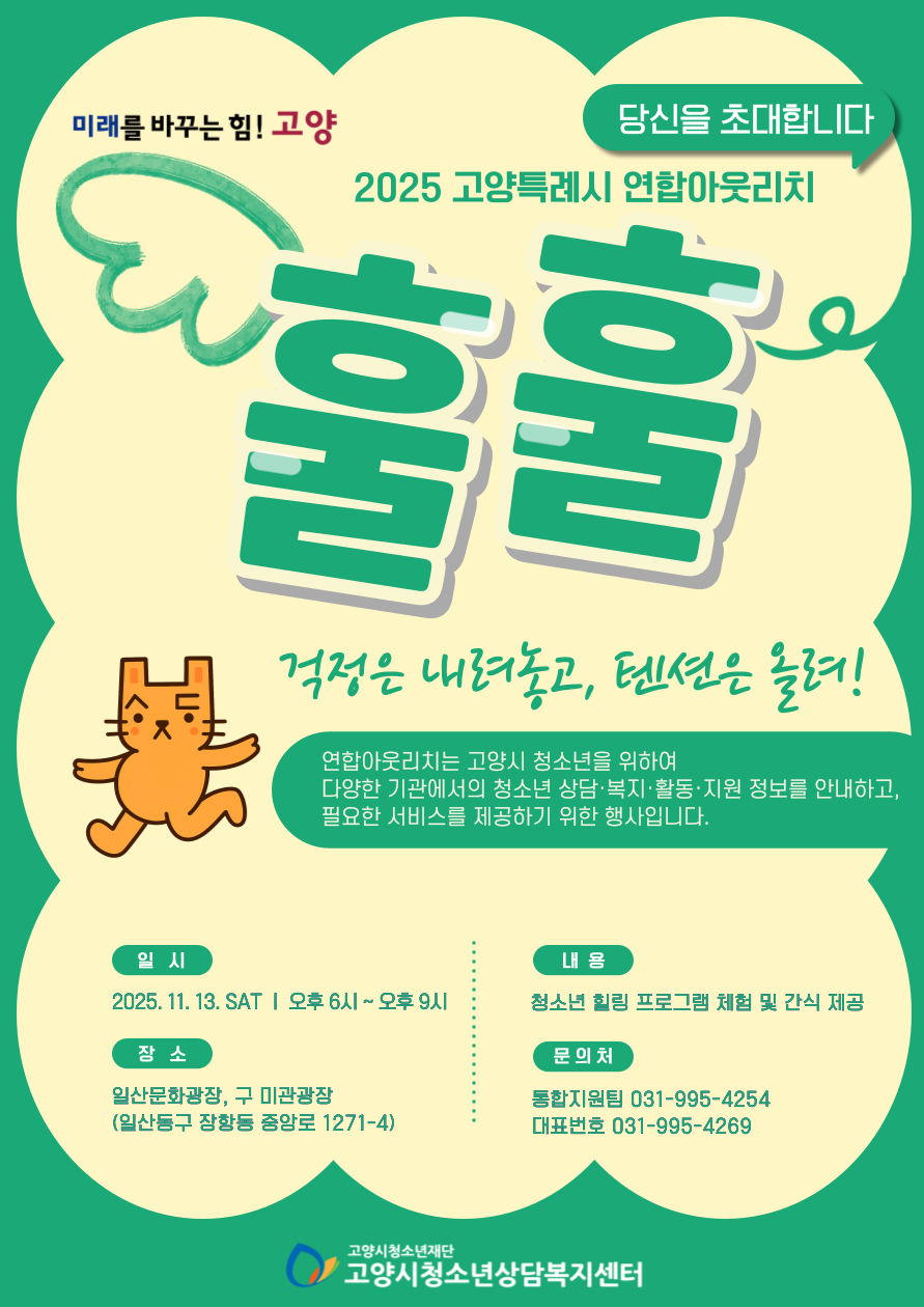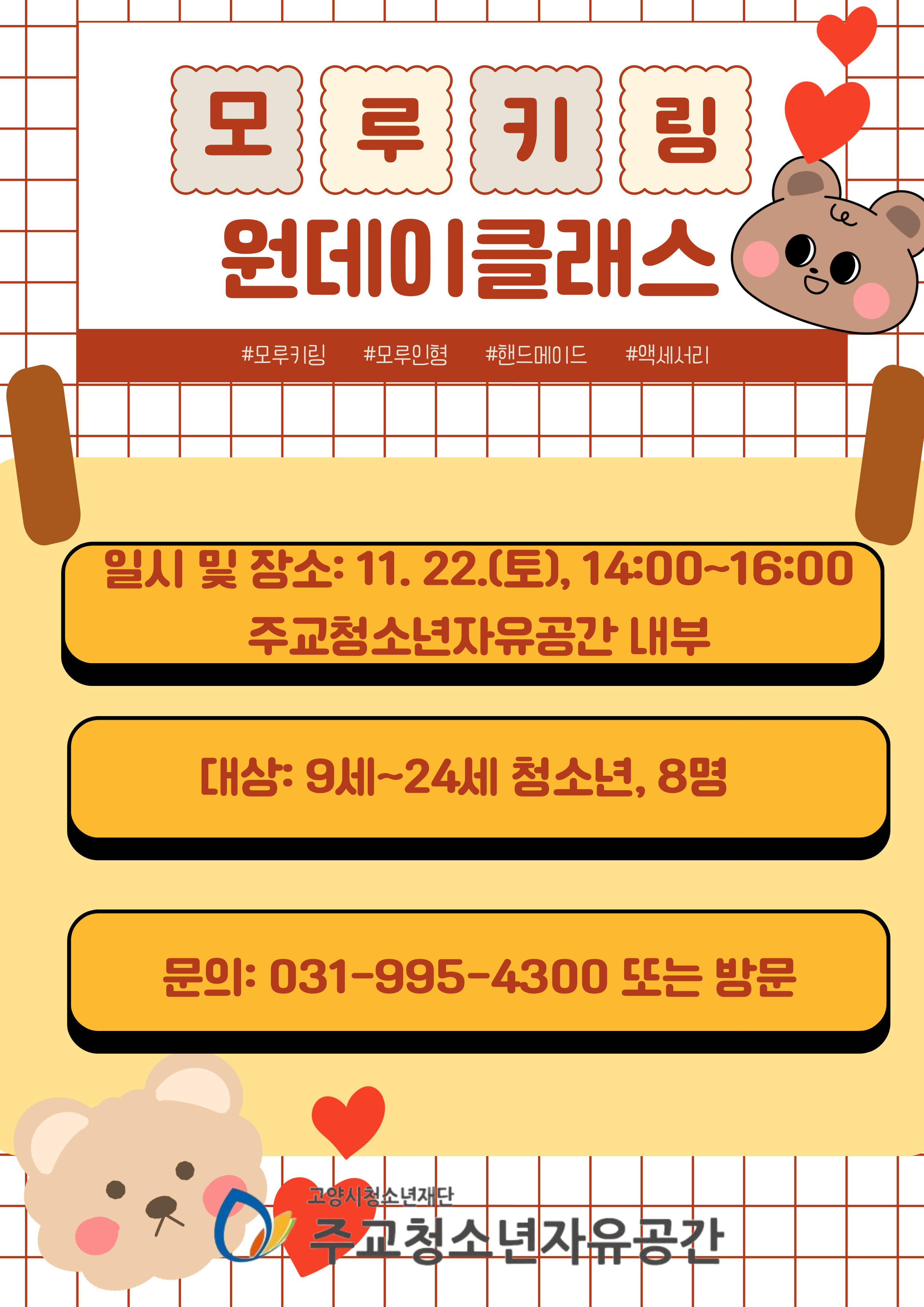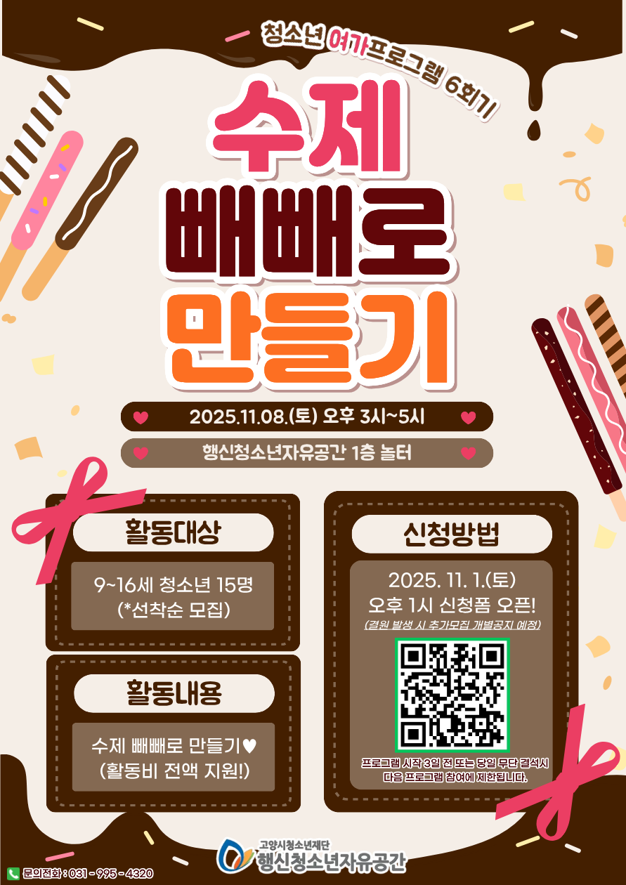 프로그램 신청 프로그램 현황 검색창 열기 시설선택 경영본부 토당청소년수련관 마두청소년수련관 일산서구청소년수련관 성사청소년문화의집 탄현청소년문화의집 고양시청소년상담복지센터 화정청소년자유공간 주교청소년자유공간 행신청소년자유공간 고양시학교밖청소년지원센터 송포청소년문화의집 검색 행신청소년자유공간 2025년 행신청소년자유공간 11월 청소년 여가 프로그램 '수제 빼빼로 만들기' 참여 청소년 모집 안내 접수기간2025-11-01 ~ 2025-11-08 운영기간 2025-11-08 ~ 2025-11-08 모집중 고양시청소년상담복지센터 2025 고양특례시 연합아웃리치 훌훌 접수기간2025-10-28 ~ 2025-11-13 운영기간 2025-11-13 ~ 2025-11-13 모집중 마두청소년수련관 제1회 고양시 청소년정책공청회 개최 접수기간2025-10-31 ~ 2025-11-14 운영기간 2025-11-15 ~ 2025-11-15 모집중 주교청소년자유공간 주교청소년자유공간 11월 청소년여가프로그램-1: 보드게임 접수기간2025-11-01 ~ 2025-11-15 운영기간 2025-11-15 ~ 2025-11-15 모집중 마두청소년수련관 2025년 자율동아리 연간 활동 발표회 접수기간2025-11-01 ~ 2025-11-17 운영기간 2025-11-22 ~ 2025-11-22 모집중 주교청소년자유공간 주교청소년자유공간 11월 청소년여가프로그램-2: 모루키링 만들기 접수기간2025-11-01 ~ 2025-11-22 운영기간 2025-11-22 ~ 2025-11-22 모집중 고양시청소년상담복지센터 집단심리검사프로그램 - MBTI 바로알기 접수기간2025-05-15 ~ 2025-11-30 운영기간 2025-05-16 ~ 2025-12-31 모집중 탄현청소년문화의집 [탄현] 탄현청소년문화의집 고객만족도 조사 접수기간2025-10-14 ~ 2025-12-13 운영기간 2025-10-14 ~ 2025-12-13 모집중 고양시청소년상담복지센터 미술치료 청소년 대상자 모집 접수기간2025-01-01 ~ 2025-12-31 운영기간 2025-01-01 ~ 2025-12-31 모집중 고양시청소년상담복지센터 놀이치료 청소년 대상자 모집 접수기간2025-01-01 ~ 2025-12-31 운영기간 2025-01-01 ~ 2025-12-31 모집중 성사청소년문화의집 2025년 성사청소년문화의집 청소년 자율동아리 모집 접수기간2025-01-01 ~ 2025-12-31 운영기간 2025-01-01 ~ 2025-12-31 모집중 고양시학교밖청소년지원센터 고양시학교밖청소년지원센터 10~12월 프로그램 안내 접수기간2025-10-01 ~ 2025-12-31 운영기간 2025-10-01 ~ 2025-12-31 모집중 마두청소년수련관 2025년 마두청소년수련관 자율동아리 ONEDOOR 기획활동 '응원의 한마디 공모전' 접수기간2025-10-24 ~ 2025-11-01 운영기간 2025-10-24 ~ 2025-12-13 마감 주교청소년자유공간 주교청소년자유공간 10월 여가프로그램 "영화로 꿈꾸는 데이" 접수기간2025-10-01 ~ 2025-10-31 운영기간 2025-10-01 ~ 2025-10-31 마감 주교청소년자유공간 주교청소년자유공간 10월 여가프로그램 "주교 가을 운동회" 접수기간2025-10-01 ~ 2025-10-24 운영기간 2025-10-01 ~ 2025-10-31 마감 성사청소년문화의집 2025년 청소년 창작공방(2) 나만의 미니어처 도시락 만들기 접수기간2025-10-11 ~ 2025-10-20 운영기간 2025-10-25 ~ 2025-10-25 마감 처음 이전 열린1페이지 2페이지 3페이지 4페이지 5페이지 6페이지 7페이지 8페이지 9페이지 10페이지 다음 맨끝
