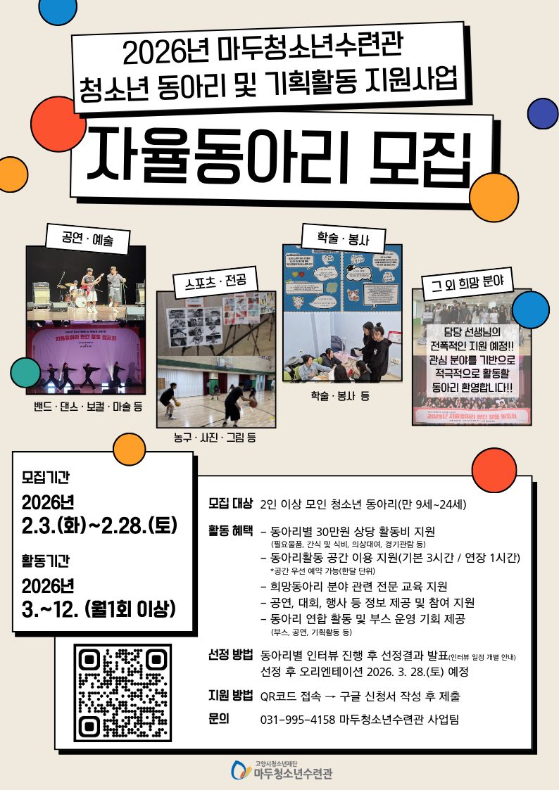 프로그램 신청 프로그램 현황 검색창 열기 시설선택 사무국 토당청소년수련관 마두청소년수련관 일산서구청소년수련관 성사청소년문화의집 탄현청소년문화의집 고양시청소년상담복지센터 화정청소년자유공간 주교청소년자유공간 행신청소년자유공간 고양시학교밖청소년지원센터 송포청소년문화의집 검색 탄현청소년문화의집 [탄현] 청소년운영위원회 별솔 12기 상시모집 접수기간2025-11-18 ~ 2026-02-28 운영기간 2026-01-01 ~ 2026-12-31 모집중 마두청소년수련관 2025년 마두청소년수련관 자율동아리 모집 접수기간2026-02-03 ~ 2026-02-28 운영기간 2026-03-01 ~ 2026-12-31 모집중 마두청소년수련관 2026년 마두청소년수련관 청소년운영위원회 신규위원 모집 접수기간2025-12-13 ~ 2026-02-14 운영기간 2026-03-01 ~ 2026-12-31 마감 마두청소년수련관 26년 마두청소년수련관 <제9대 고양시청소년의회> 의원을 모집합니다! 접수기간2025-12-11 ~ 2026-02-07 운영기간 2026-02-21 ~ 2026-12-31 마감 마두청소년수련관 제 26대 고양시 청소년참여위원회 위원 모집 공고 접수기간2025-01-01 ~ 2026-02-06 운영기간 2025-01-01 ~ 2026-02-06 마감 고양시청소년상담복지센터 미술치료 청소년 대상자 모집 접수기간2025-01-01 ~ 2025-12-31 운영기간 2025-01-01 ~ 2025-12-31 마감 고양시청소년상담복지센터 놀이치료 청소년 대상자 모집 접수기간2025-01-01 ~ 2025-12-31 운영기간 2025-01-01 ~ 2025-12-31 마감 성사청소년문화의집 2025년 성사청소년문화의집 청소년 자율동아리 모집 접수기간2025-01-01 ~ 2025-12-31 운영기간 2025-01-01 ~ 2025-12-31 마감 고양시학교밖청소년지원센터 고양시학교밖청소년지원센터 10~12월 프로그램 안내 접수기간2025-10-01 ~ 2025-12-31 운영기간 2025-10-01 ~ 2025-12-31 마감 주교청소년자유공간 주교청소년자유공간 12월 청소년여가프로그램: 영화로 꿈꾸는 데이 접수기간2025-12-01 ~ 2025-12-31 운영기간 2025-12-01 ~ 2025-12-31 마감 주교청소년자유공간 주교청소년자유공간 12월 청소년여가프로그램: 크리스마스 케이크 만들기 접수기간2025-12-01 ~ 2025-12-31 운영기간 2025-12-01 ~ 2025-12-31 마감 주교청소년자유공간 주교청소년자유공간 12월 청소년창작프로그램 "크리스마스 리스 만들기" 접수기간2025-12-01 ~ 2025-12-31 운영기간 2025-12-01 ~ 2025-12-31 마감 탄현청소년문화의집 [탄현] 탄현청소년문화의집 고객만족도 조사 접수기간2025-10-14 ~ 2025-12-13 운영기간 2025-10-14 ~ 2025-12-13 마감 고양시청소년상담복지센터 집단심리검사프로그램 - MBTI 바로알기 접수기간2025-05-15 ~ 2025-11-30 운영기간 2025-05-16 ~ 2025-12-31 마감 주교청소년자유공간 주교청소년자유공간 11월 청소년여가프로그램: 영화로 꿈꾸는 데이 접수기간2025-11-01 ~ 2025-11-30 운영기간 2025-11-01 ~ 2025-11-30 마감 고양시청소년상담복지센터 2025년 부모자녀 원데이 힐링 캠프 (추가) 접수기간2025-11-06 ~ 2025-11-26 운영기간 2025-11-29 ~ 2025-11-29 마감 처음 이전 열린1페이지 2페이지 3페이지 4페이지 5페이지 6페이지 다음 맨끝