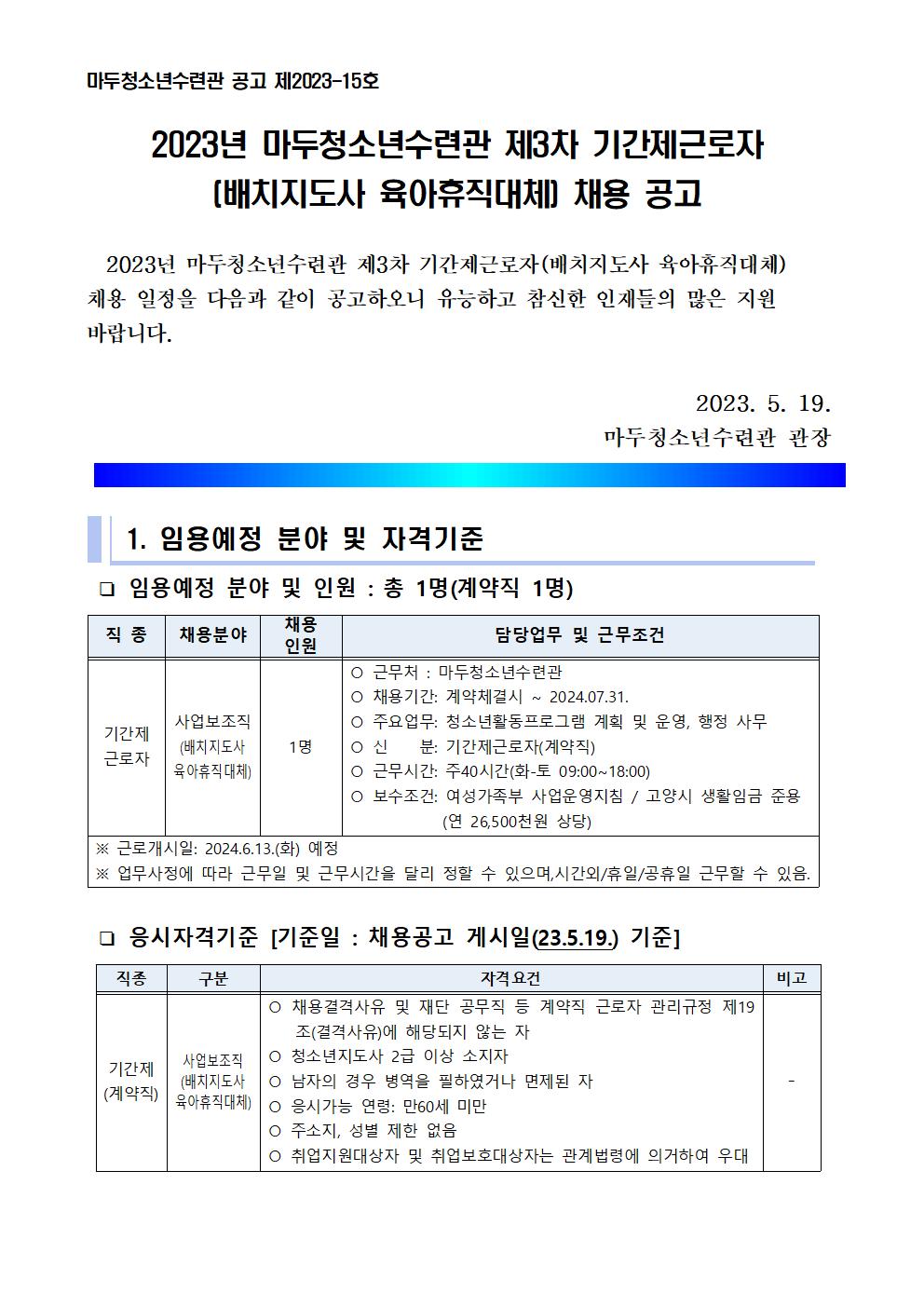 - 2023년 마두청소년수련관 제3차 기간제근로자배치지도사 육아휴직 대체 채용 공고문.pdf 224회 다운로드 | DATE : 2023-05-23 10:38:59