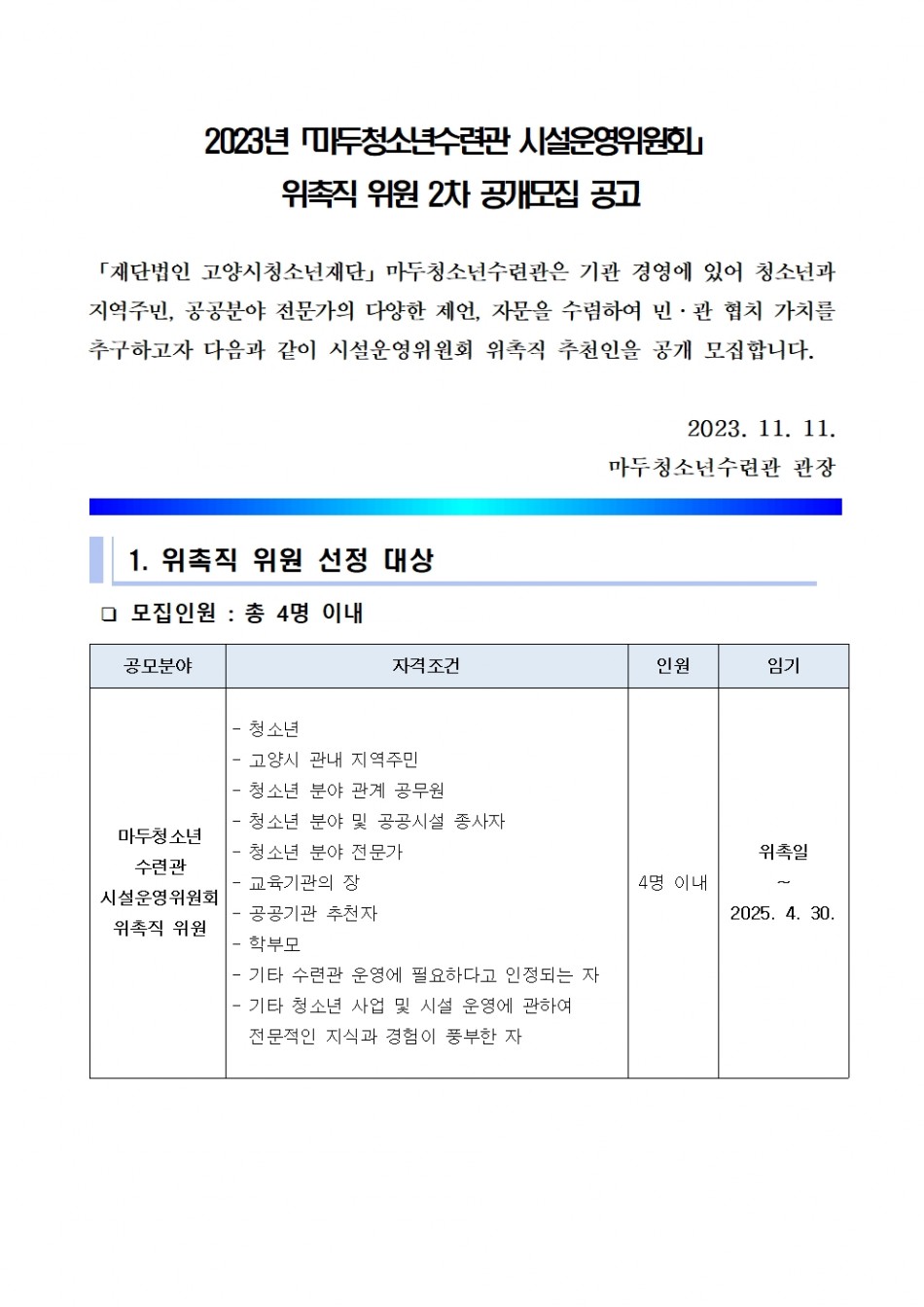 마두청소년수련관 마두청소년수련관 시설운영위원회 위촉직 위원 2차 공개모집 페이지 정보 조회수 : 3,448회 등록일 : 2023-11-11 본문 첨부파일 모집공고.pdf 12회 다운로드 | DATE : 2023-11-11 18:52:20 이력서 및 서면 면접 기술서 양식.hwp 4135회 다운로드 | DATE : 2023-11-11 18:49:52 목록 이전글[마감] 11월 25일 토요일! 놀터에서 무비데이! 다음글개관 10주년 기념행사 안내 (마두뾲 & 마청수 10살 생일파티)