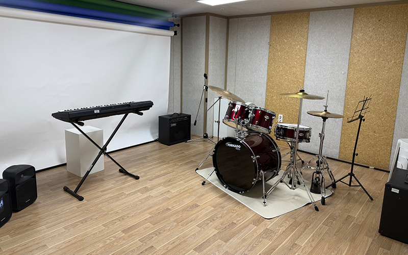 합주실, 방음부스(전자피아노, 드럼, 기타앰프 2개, 마이크 앰프 2개, 유선 마이크)