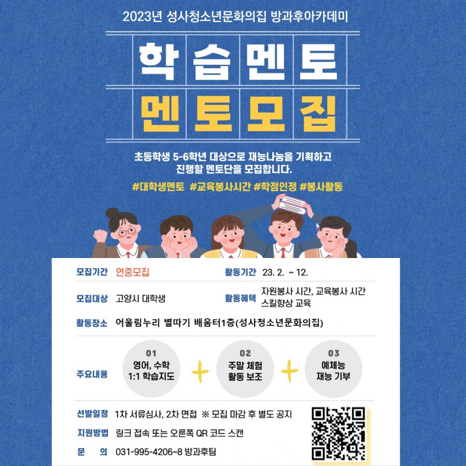 성사청소년문화의집 성사청소년문화의집 방과후아카데미 자원봉사자(추가) 모집