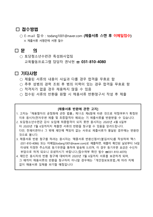 토당청소년수련관 [채용공고] 2020년 토당청소년수련관 신규프로그램 강사모집(~4월 6일) 페이지 정보 조회수 : 16,795회 등록일 : 2020-03-26 본문 첨부파일 2020년 토당청소년수련관 강사 응시원서 외 서류 각 1부.hwp 12126회 다운로드 | DATE : 2020-03-26 18:20:54 목록 이전글고양시청소년상담복지센터 놀이치료사(강사)채용공고(추가모집) 다음글2020년 청소년 창작연극 사업 전문강사 1차 합격자 공고