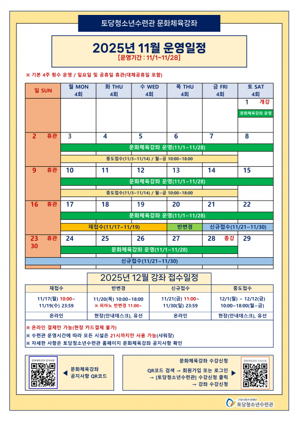 2025년 11월 문화체육강좌 운영일정 공지 페이지 정보 조회수 : 96회 등록일 : 2025-10-15 본문 목록 다음글2025년 11월 패션디자인스쿨(모루인형반) 운영일정 변경 안내